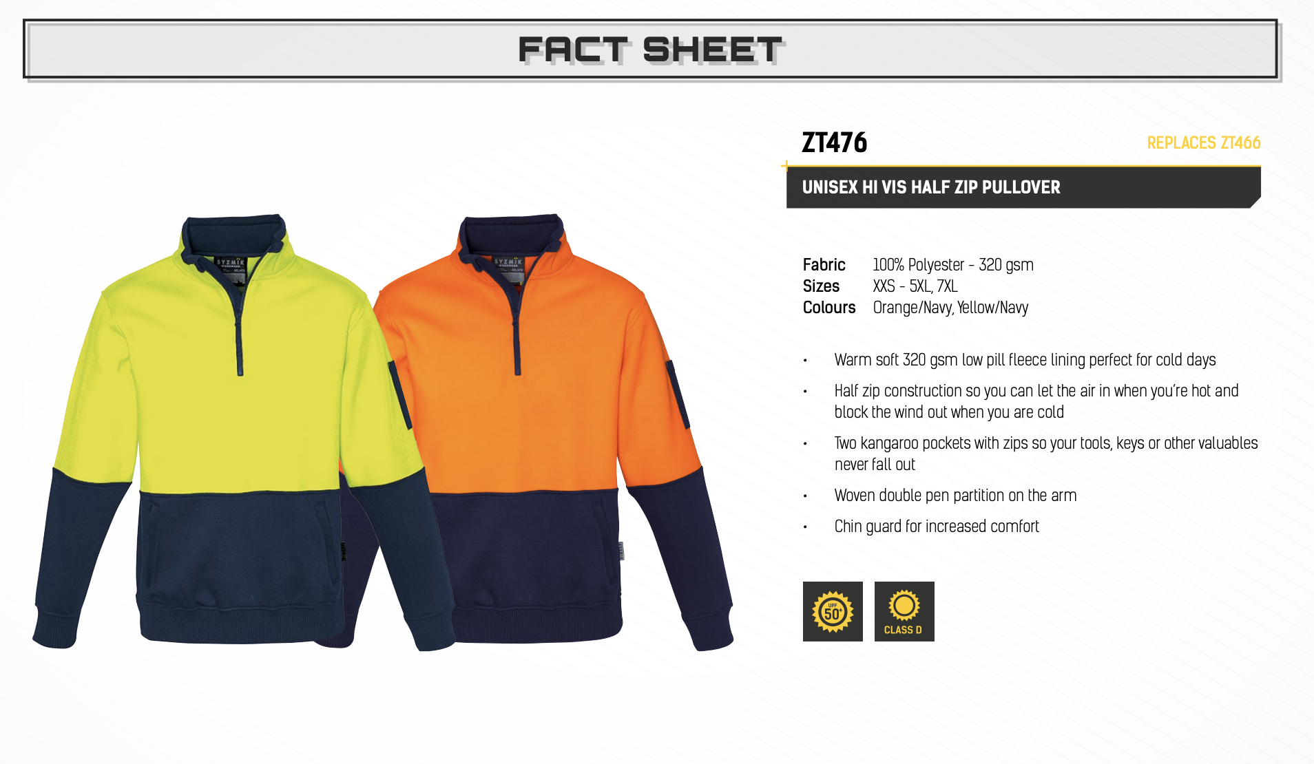 An affordable half zip high visibility jumper that is UPF 50+ and meets AS/NZS 4602.1-2011 Class D for day time use. The super warm 320 gsm low pile fleece is perfect for those cold winter days.